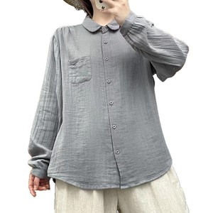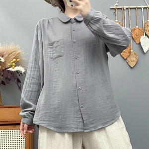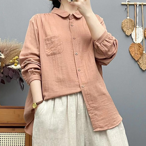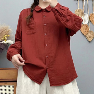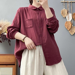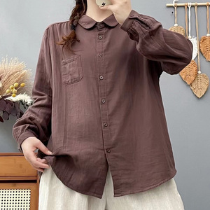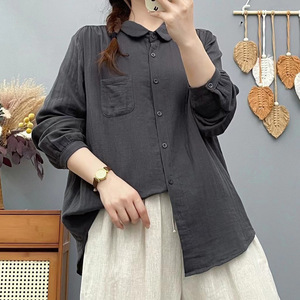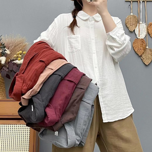 双层棉纱长袖衬衫女宽松大码显瘦秋装新日系文艺休闲翻领衬衣女