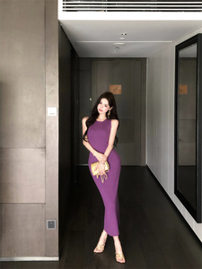 纯欲御姐风无袖背心连衣裙女夏季紫色收腰开叉裙子显身材包臀长裙