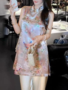 【晴蝶恋荷】人丝香纱国风新中式复古立领盘扣中长款夏季无袖上衣
