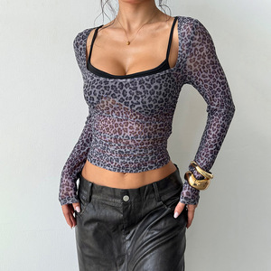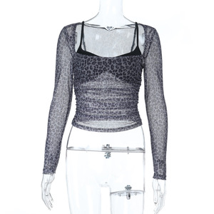JY25418豹纹印花假两件长袖修身上衣ins欧美秋季新款辣妹百搭上衣