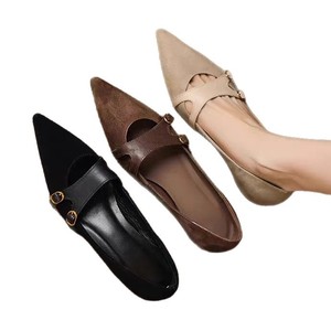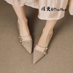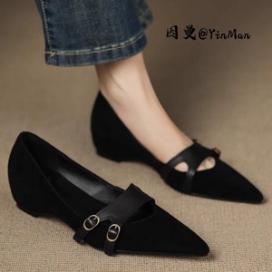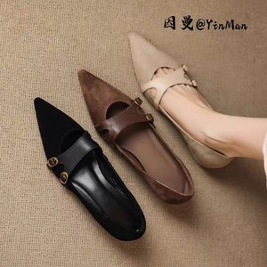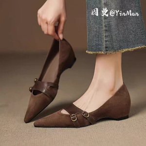 YinMan~ 复古棕色尖头平底单鞋2025新款法式显瘦浅口内增高小皮鞋
