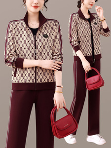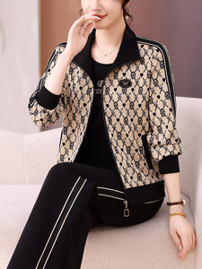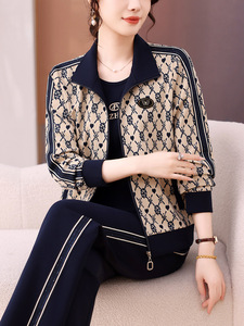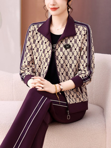 2025年春秋女士印花时尚休闲套装立领妈妈洋气长袖拉链卫衣三件套