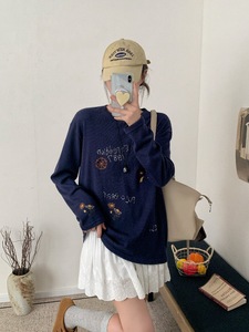 重工刺绣t恤2025秋季新款慵懒感圆领打底衫百搭韩系长袖上衣女