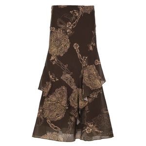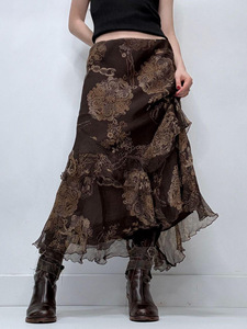 2025新款Vintage小众复古印花撞色双层波浪边低腰显瘦半身裙长款