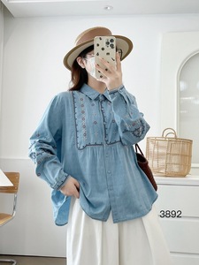 3892重工刺绣翻领长袖牛仔衬衫女秋季新款文艺复古宽松休闲上衣