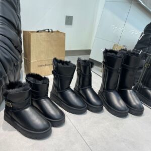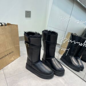 PRUGGI羊皮毛一体雪地靴女桑坡冬季新款金属黑工装骑士靴卡扣厚底