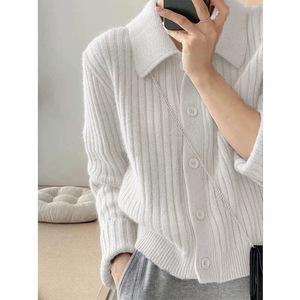 洋气宽松短款POLO领羊绒针织开衫女秋冬坑条加厚外套小个子羊毛衫
