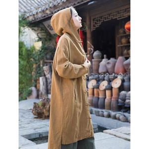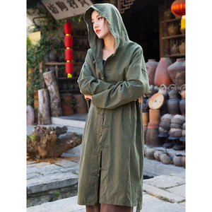 苎麻连帽风衣女春秋新款唐装中国风禅意披风砂洗复古盘扣外衣禅修