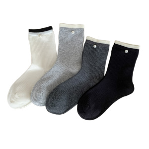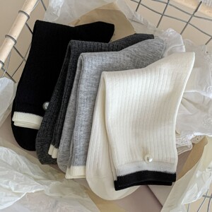 春秋季袜子女日系拼色中筒袜简约珍珠饰品无骨袜竖条灰色堆堆袜