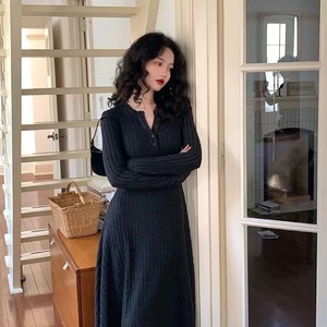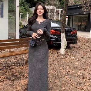 欧美跨境外贸针织长袖连衣裙气质显瘦裙子复古韩版绒V领法式长裙