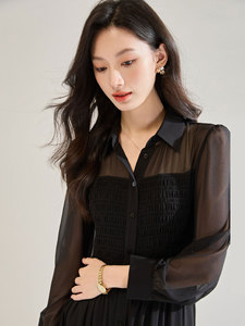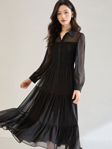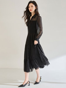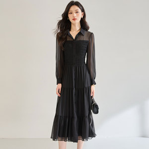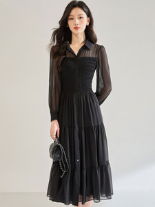 25秋季优雅气质收腰抽褶灯笼袖黑色雪纺长款连衣裙25570