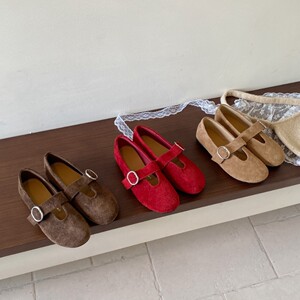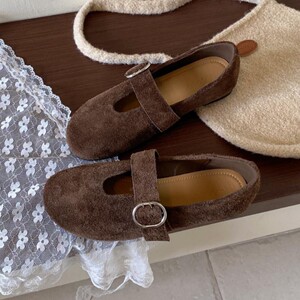 复古真皮玛丽珍鞋女2025秋款一字带拉毛感平底单鞋轻便软底勃肯鞋