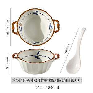 10英寸竹柄双耳汤碗+带孔勺白色大号★★