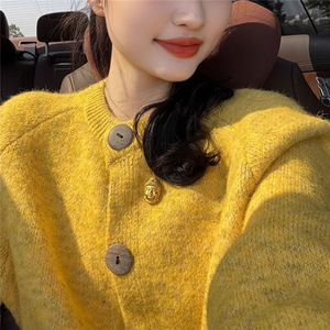 2025宽松慵懒风黄色针织开衫女春秋圆领毛衣外套休闲百搭