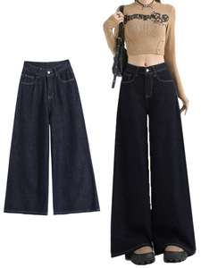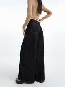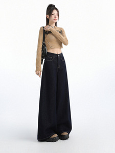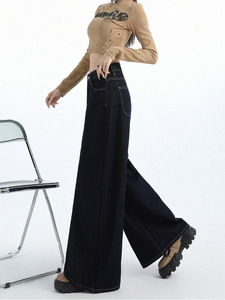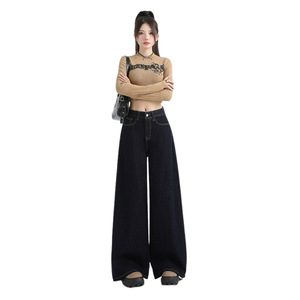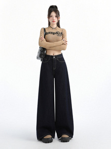 美式深蓝色高腰女式牛仔裤阔腿宽松2025年秋季新款jenas直筒长裤