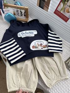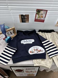 杉伴韩系男小童拼接条纹卡通贴布印花连帽款上衣男宝宝宽松款卫衣