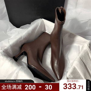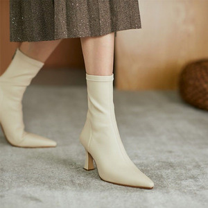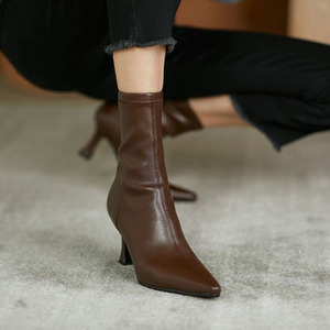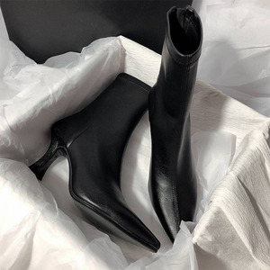 真皮短靴女高跟细跟尖头后拉链2025新款春秋季韩版弹力瘦瘦靴