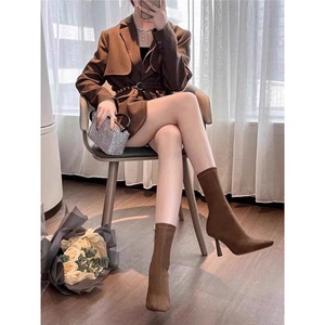 高跟短靴女2025春秋细跟中筒瘦瘦靴小方头显瘦气质绒面弹力靴