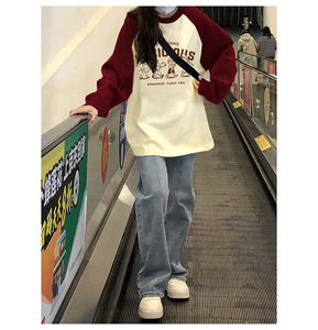 酒红拼杏【欧洲站/简约/长袖t恤女/爆版/微胖/韩版/设计感/11/12/13/14/15/16/1