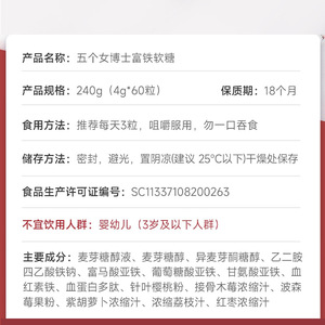 五个女博士富铁软糖含铁元素4.6mg/颗荔枝味60颗/瓶