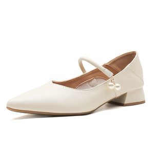 法式粗跟真皮玛丽珍女鞋小香风浅口尖头晚晚风配裙子单鞋女大码