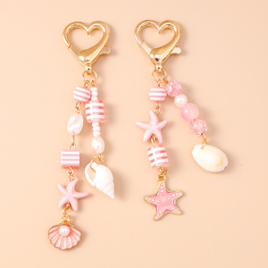 跨境新款时尚珍珠贝壳海星钥匙扣潮流百搭串珠海螺钥匙圈包包挂件
