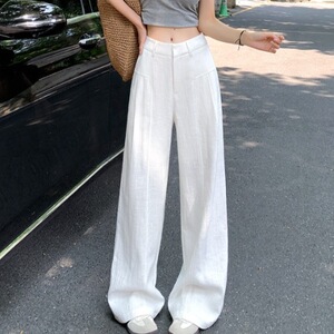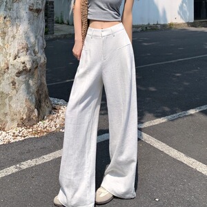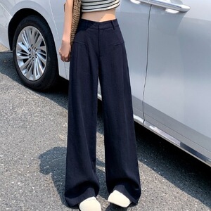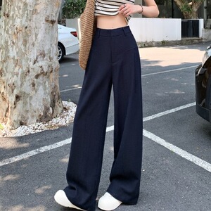 老钱风窄版亚麻弯刀阔腿裤女夏薄款藏青色棉绸裤子慵懒直筒西装裤