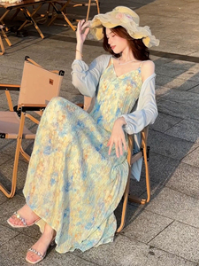 度假风v领碎花吊带连衣裙子女夏季2025新款法式高级显瘦气质长裙