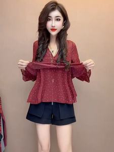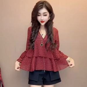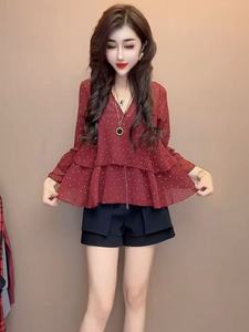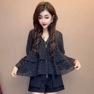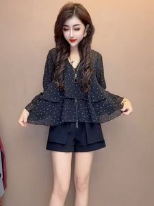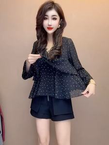 法式设计感很仙的雪纺衬衫女V领黑色波点上衣喇叭袖荷叶边雪纺衫