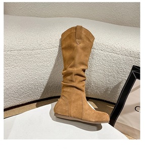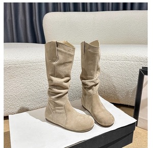 牛皮版勃肯长筒靴女2025秋冬新款褶皱堆堆靴内增高博肯长靴骑士靴