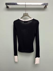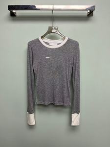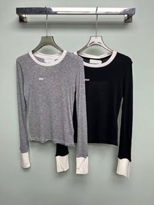 南油高定2025早秋新款圆领字母刺绣拼色长袖打底衫显瘦通勤百搭