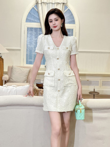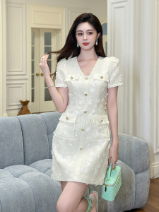 2025夏季新款女装小香风V领单排扣立体花朵显瘦小个子连衣裙21756
