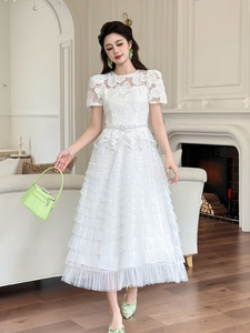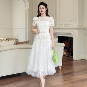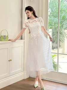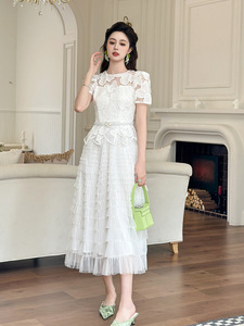 仙女气质长裙2025夏季新款女装重工水溶蕾丝拼接网纱连衣裙15456