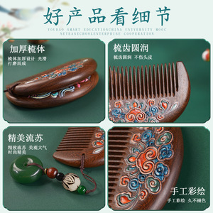 黑金檀木彩绘梳实木梳子便携月梳加厚宽齿家用木质女士长发美发梳