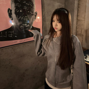 灰色大翻领正肩外套卫衣女款秋修身秋季韩系穿搭收腰设计感上衣女