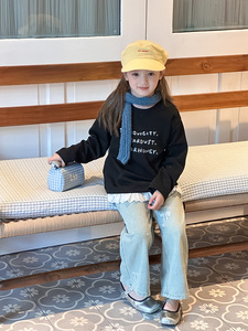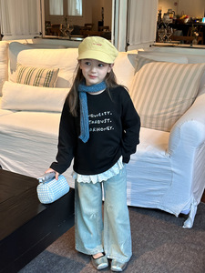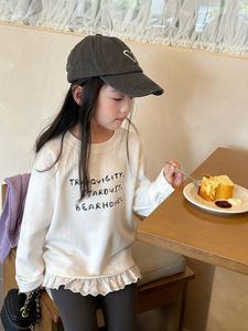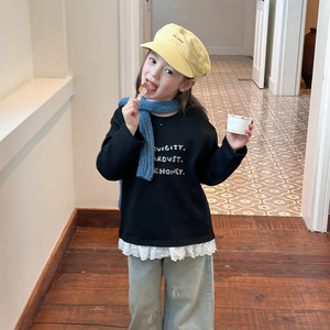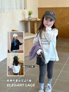 艾摩贝贝2025秋中大女童休闲气质甜美蕾丝花边拼接打底衫字母上衣