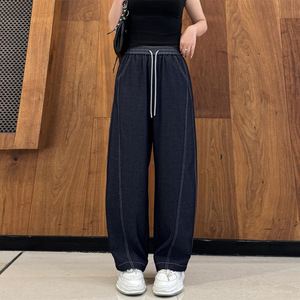 2025秋夏松紧腰宽松垂感休闲直筒女高腰显瘦牛仔窄版阔腿裤弯刀裤