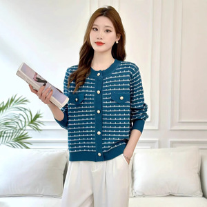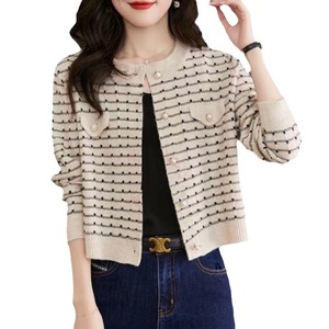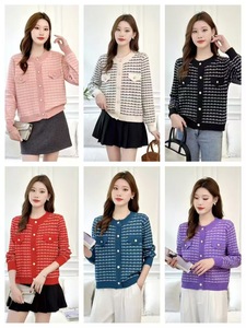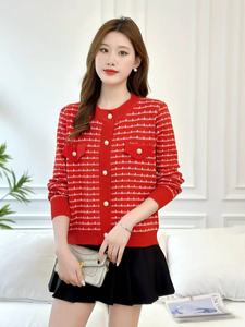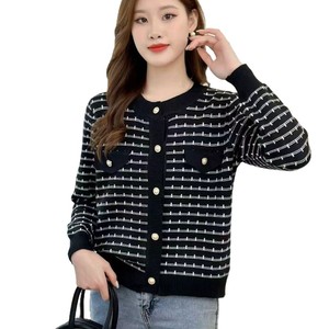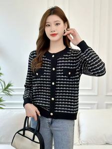 跨境春秋小香风短款毛衣小外套女士秋装新款格子外搭针织开衫上衣