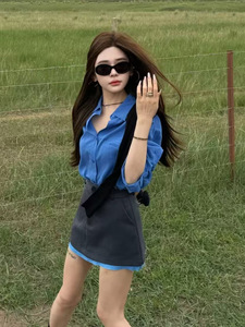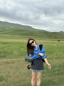 米娜家草原娜日太泡菜衬衫+披肩+灰色蓝边西装半裙套装