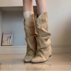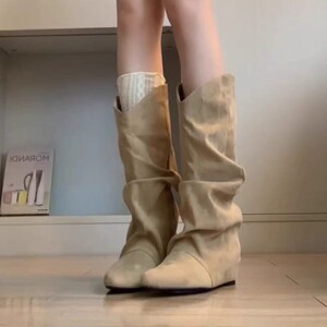 现货版~内增高尖头褶皱堆堆靴不过膝长靴女显瘦复古西部靴中筒靴