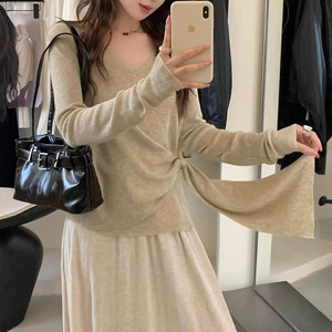 2025年秋季法式不规则系带收腰针织衫女温柔气质显瘦修身毛衣上衣
