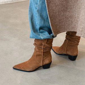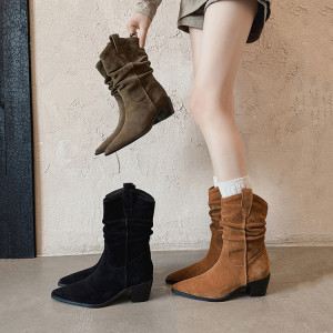 高丝光牛皮堆堆靴女西部靴秋冬新款真皮粗中跟套筒女中筒靴单靴潮