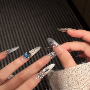 蓝调长尖纯手工穿戴甲显白爆闪满钻腮红猫眼美甲贴片可拆卸