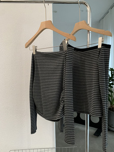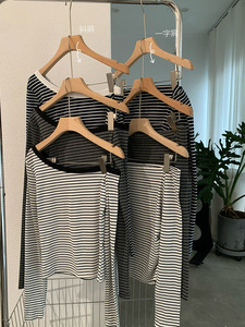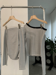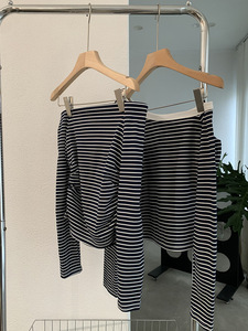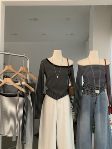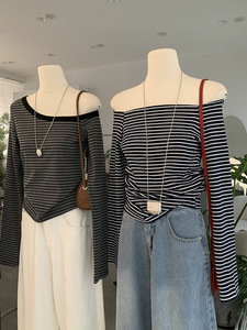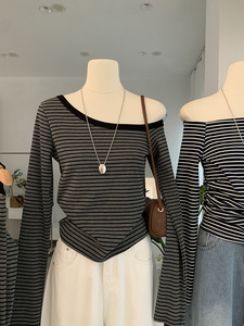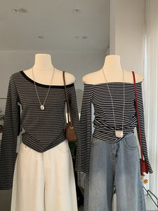 欧玛莱 一字领修身显瘦撞色条纹长袖T恤纯欲风秋季百搭上衣女4481