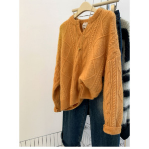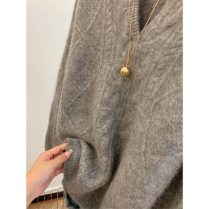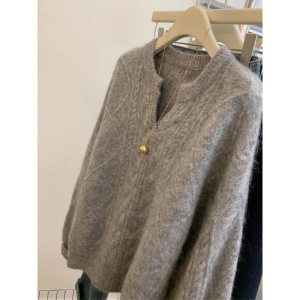 高级感灰色v领麻花浣熊绒毛衣女秋冬慵懒风加厚内搭羊绒针织上衣