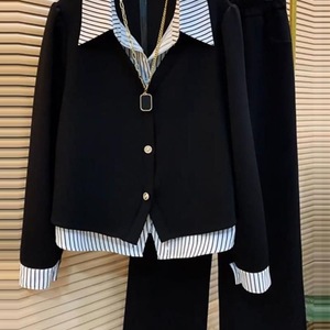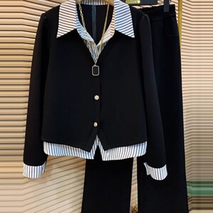 套装女2025春秋新款条纹衬衫领假两件单排扣上衣阔腿裤显瘦两件套