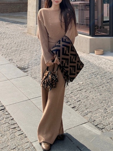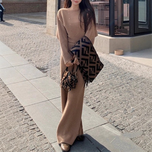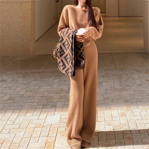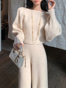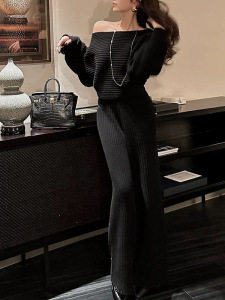 跨境针织套装女秋季新款2025高级感一字肩长袖毛衣+阔腿裤两件套