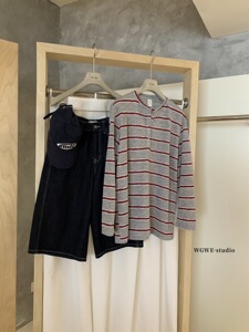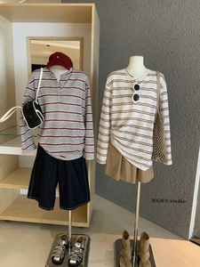 WGWE6715#2025早秋新款撞色条纹长袖T恤慵懒宽松休闲防晒罩衫上衣