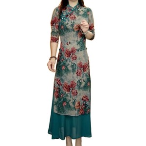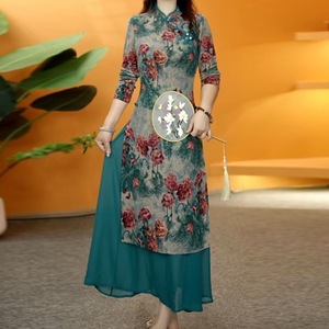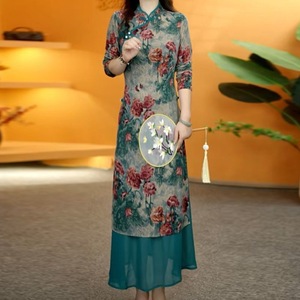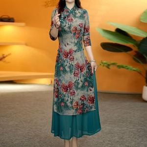 2025时尚妈妈装新中式丝旗袍连衣裙女士气质遮肚显瘦连衣裙中长款