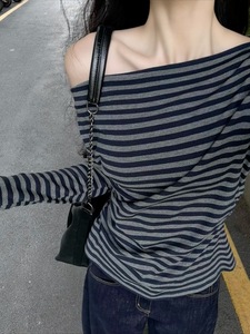 韩式慵懒一字肩条纹款长袖t恤女夏季松弛感修身wintage风斜肩上衣